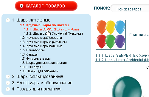 1. Выберите интересующую вас категорию шаров в Каталоге товаров, воспользовавшись левым вертикальным меню. Выберите интересующую вас группу шаров и соответствующего производителя.